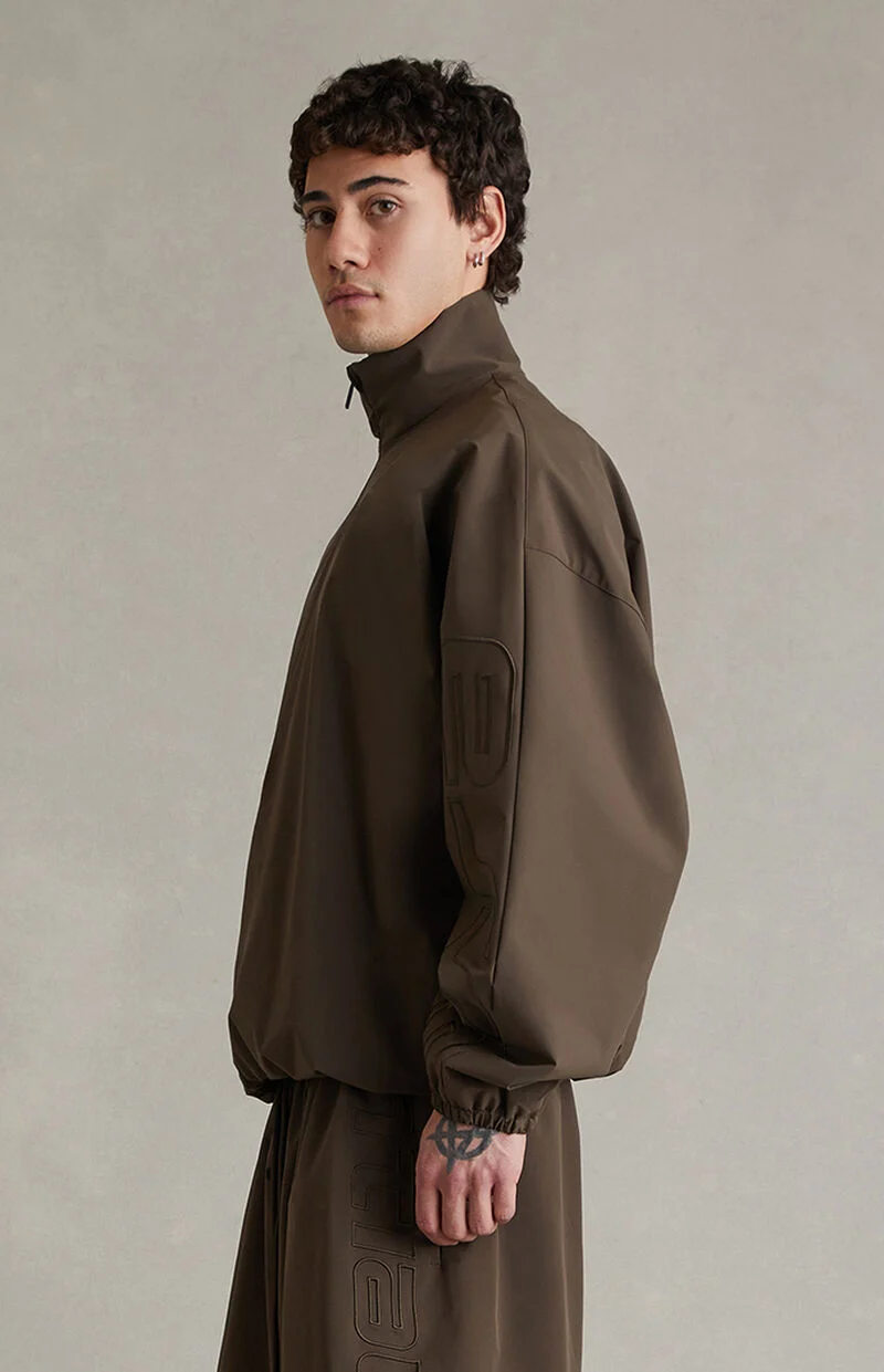 Fear of God ESSENTIALS updates a classic layering piece with the Brown Active Trace Half Zip Track Jacket, featuring dropped shoulders, a stand-up collar, and an oversized fit for relaxed, modern styling. Finished with Essentials embroidery down the sleeve, a half-zip front closure, hidden side seam pockets, elasticized cuffs and hem, and a rubber brand label at the upper back, it delivers clean, elevated streetwear with signature detailing.