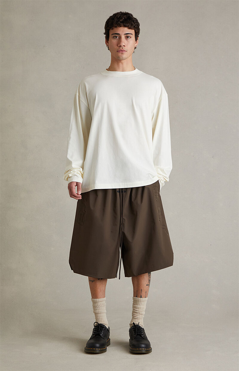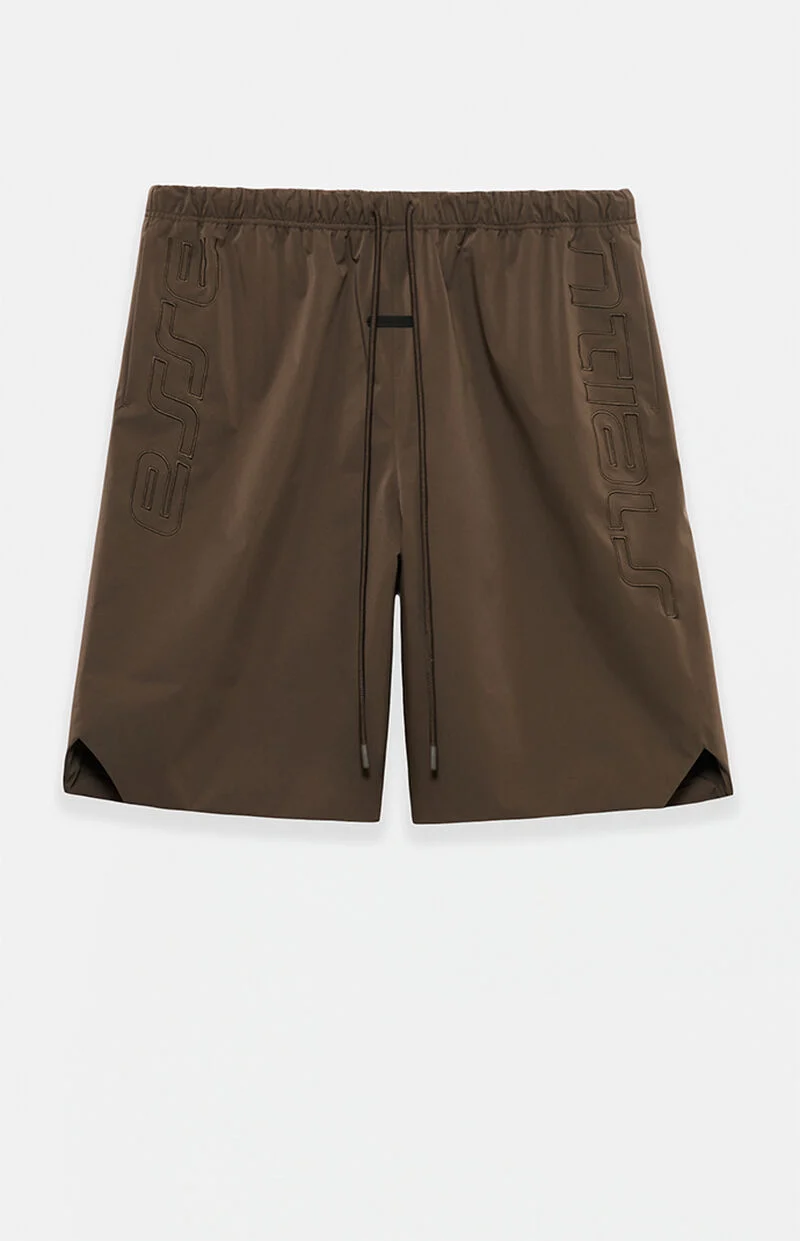 Fear of God ESSENTIALS elevates casual layering with the Brown Active Trace Relaxed Shorts, featuring a relaxed fit, longer inseam, and breathable mesh lining for all-day comfort. Finished with a drawstring waistband, side seam pockets, Essentials embroidery down the sides, small side slits, and a rubber brand label at the front, they deliver clean, effortless streetwear with signature detailing.