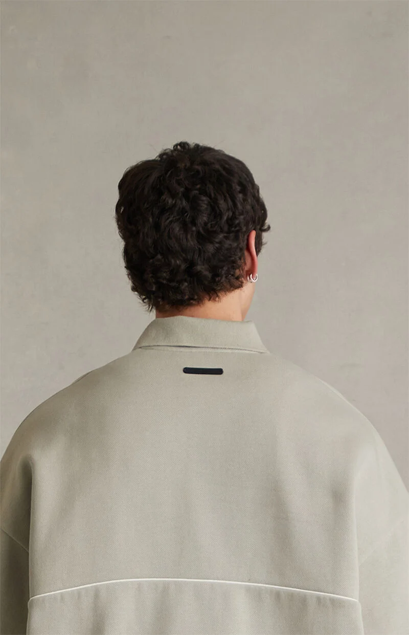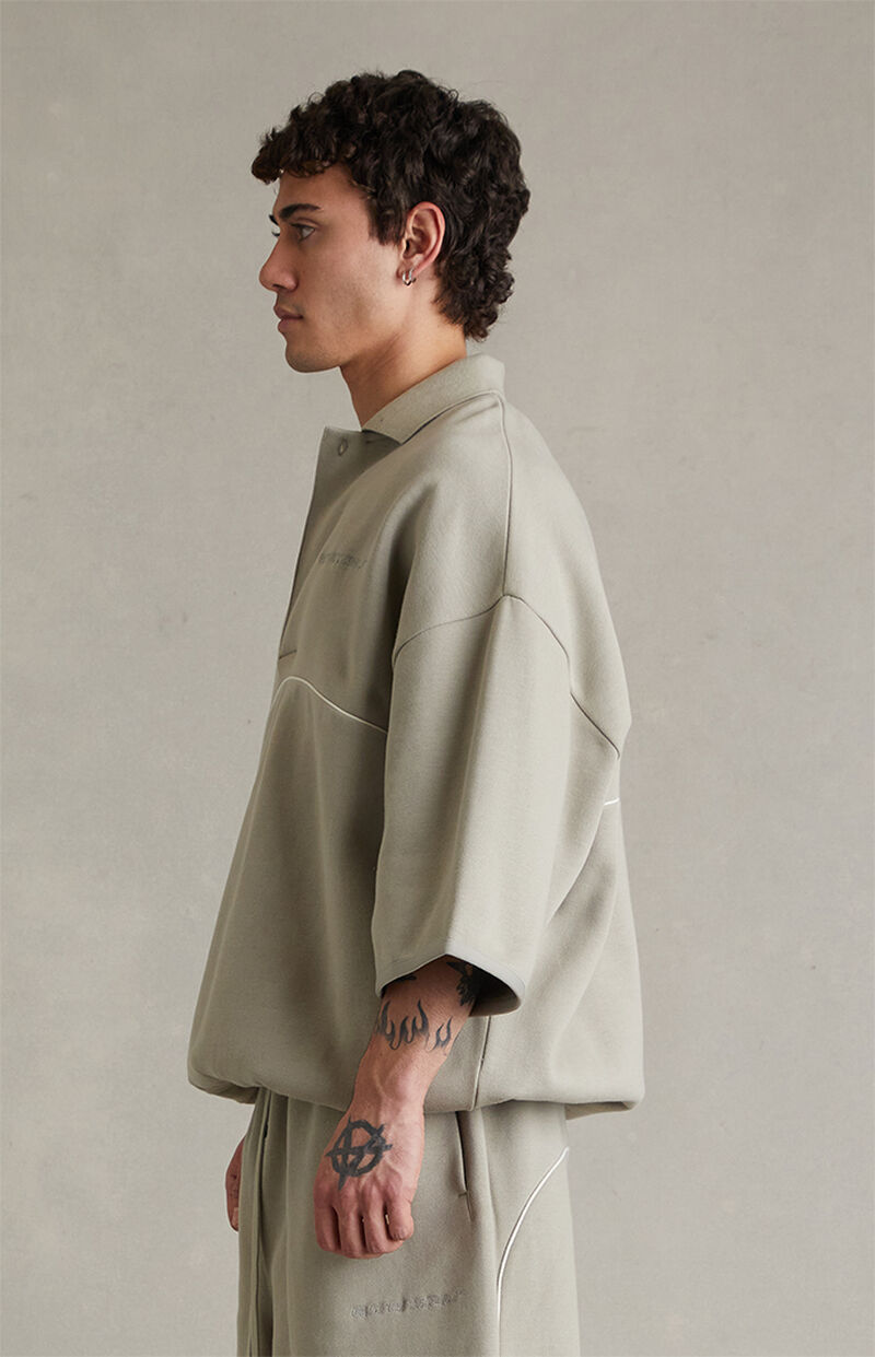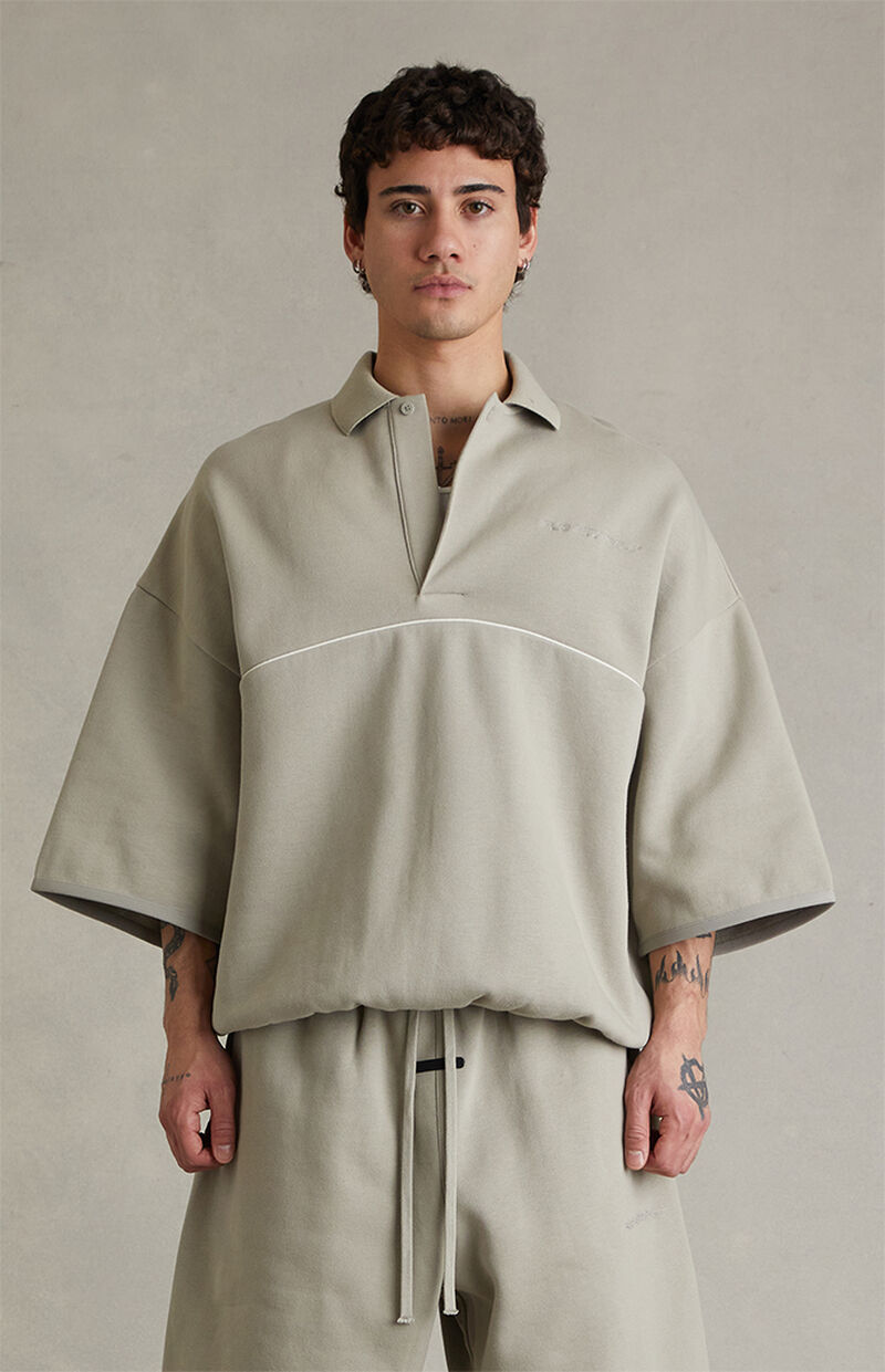Fear of God ESSENTIALS updates a refined staple with the Seal Active Trace 3/4 Sleeve Modern Polo Sweatshirt, featuring 3/4-length sleeves with dropped shoulders, an oversized fit, and a soft fleece lining for added comfort. Finished with contrast piping across the front and back, Essentials embroidery at the left chest, a polo collar with a single-button front placket, an elastic binded hem, and a rubber brand label at the upper back, it delivers a clean, contemporary take on elevated everyday wear.