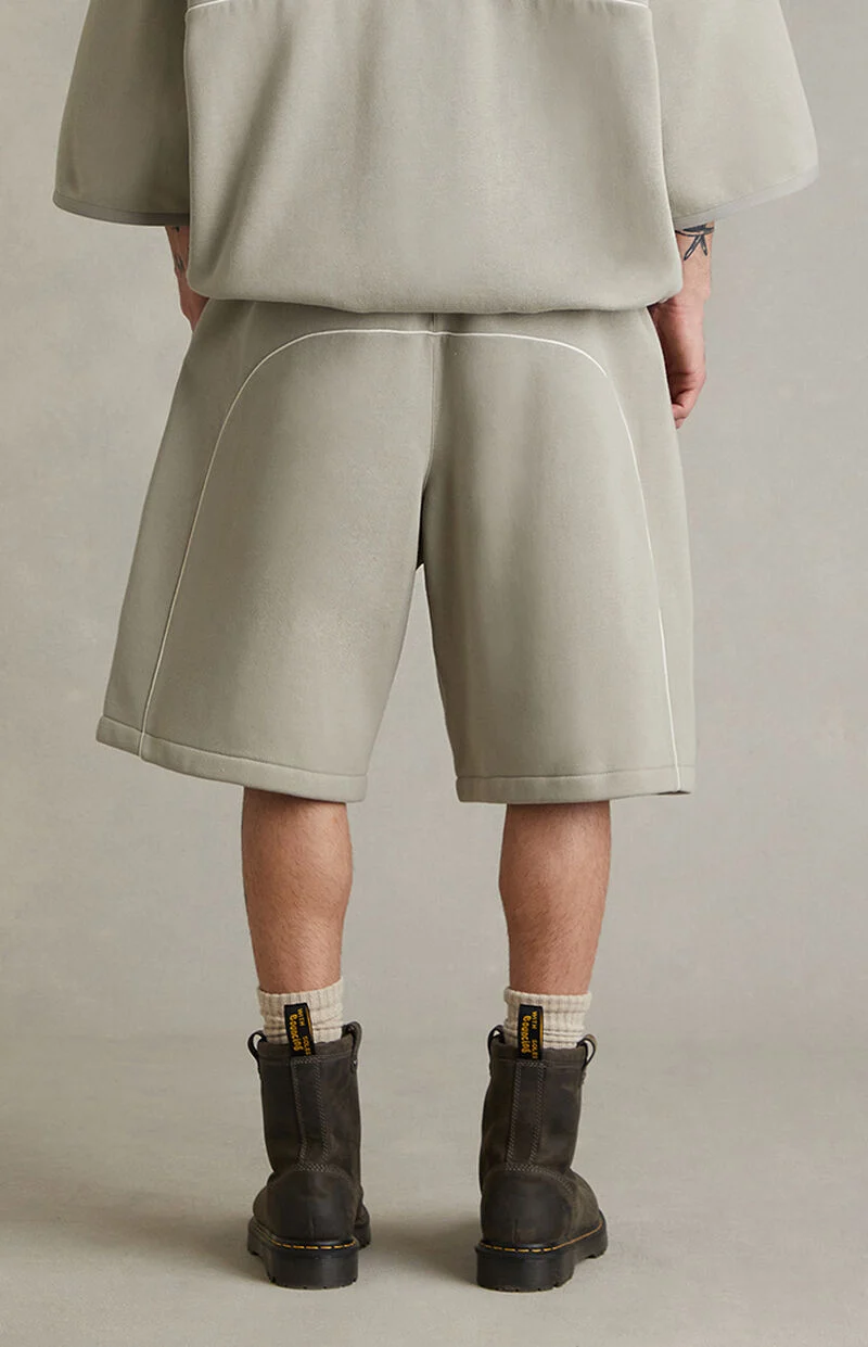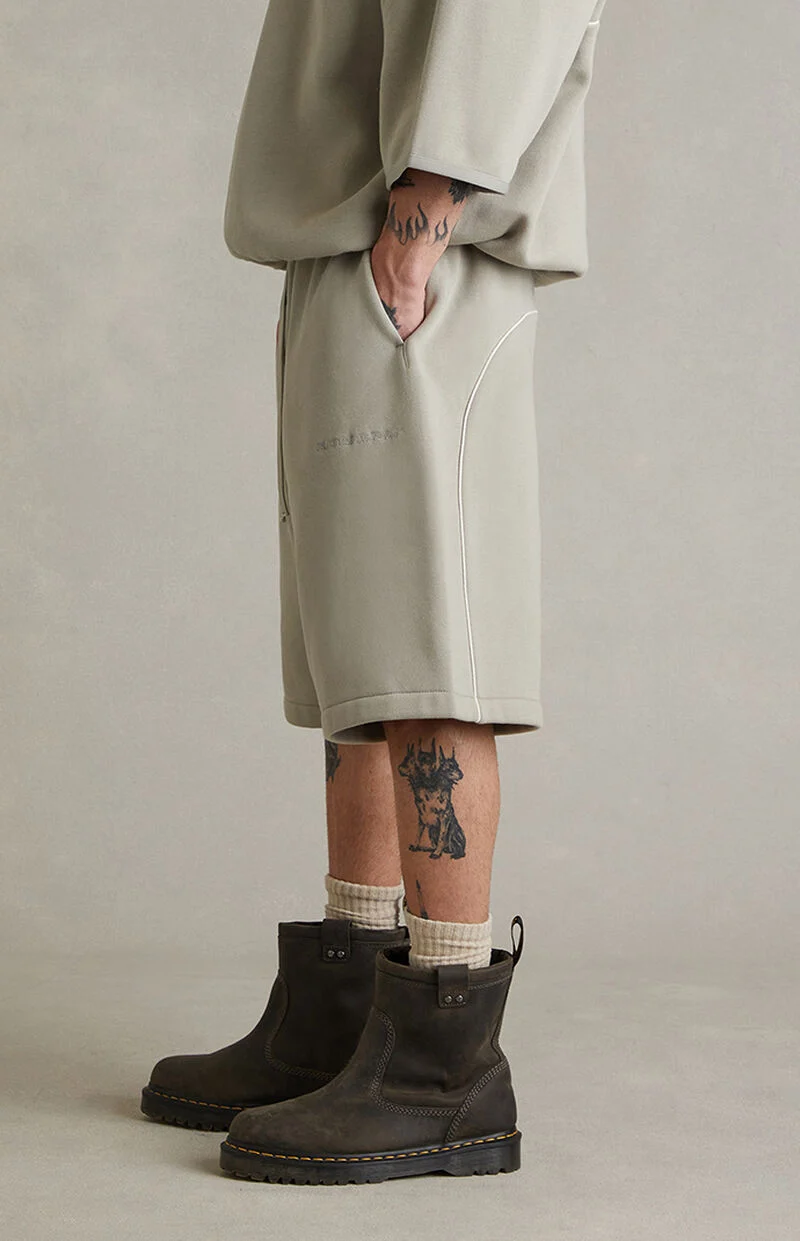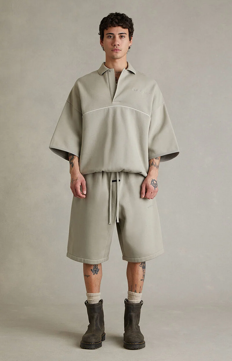 Fear of God ESSENTIALS updates everyday comfort with the Seal Active Trace Relaxed Sweat Shorts, featuring a relaxed fit, longer inseam, and soft fleece lining for effortless wear. Finished with a drawstring waistband, side seam pockets, Essentials embroidery at the hip, contrast piping on the back, and a rubber brand label at the front, they deliver clean, elevated streetwear with subtle signature detailing.