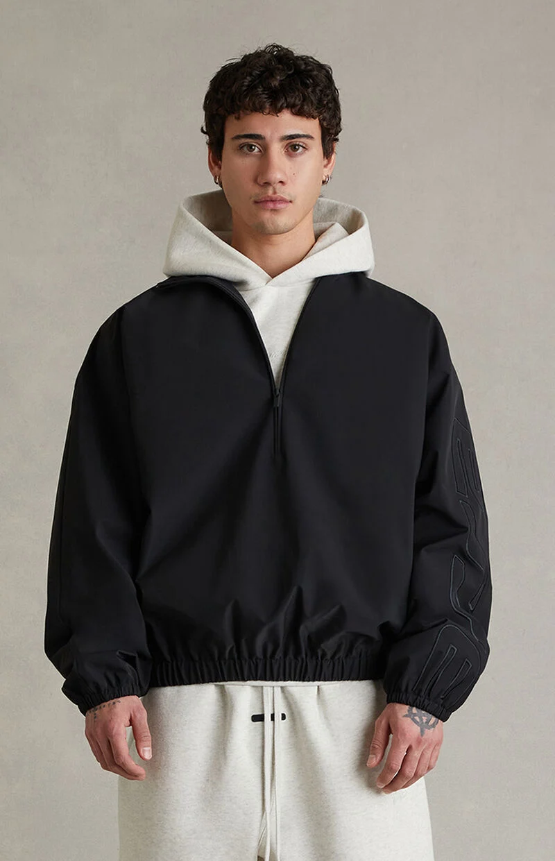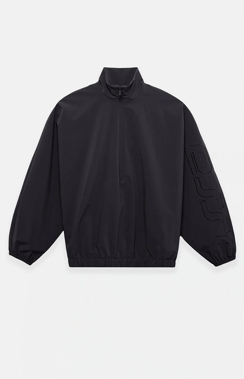 Fear of God ESSENTIALS updates a classic layering piece with the Vintage Black Active Trace Half Zip Track Jacket, featuring dropped shoulders, a stand-up collar, and an oversized fit for relaxed, modern styling. Finished with Essentials embroidery down the sleeve, a half-zip front closure, hidden side seam pockets, elasticized cuffs and hem, and a rubber brand label at the upper back, it delivers clean, elevated streetwear with signature detailing.