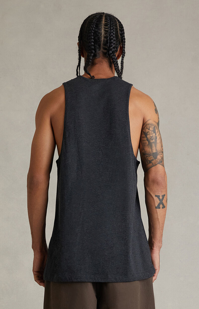 Fear of God ESSENTIALS keeps it simple and elevated with the Vintage Black Signature Tank Top, crafted from soft tri-blend fabric with wide fixed straps and a classic U-neckline. Finished with Essentials script logo graphic at the upper back, it delivers effortless streetwear style with a clean, minimal look.