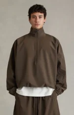 Fear of God ESSENTIALS updates a classic layering piece with the Brown Active Trace Half Zip Track Jacket, featuring dropped shoulders, a stand-up collar, and an oversized fit for relaxed, modern styling. Finished with Essentials embroidery down the sleeve, a half-zip front closure, hidden side seam pockets, elasticized cuffs and hem, and a rubber brand label at the upper back, it delivers clean, elevated streetwear with signature detailing.