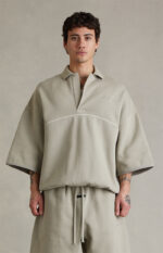 Fear of God ESSENTIALS updates a refined staple with the Seal Active Trace 3/4 Sleeve Modern Polo Sweatshirt, featuring 3/4-length sleeves with dropped shoulders, an oversized fit, and a soft fleece lining for added comfort. Finished with contrast piping across the front and back, Essentials embroidery at the left chest, a polo collar with a single-button front placket, an elastic binded hem, and a rubber brand label at the upper back, it delivers a clean, contemporary take on elevated everyday wear.